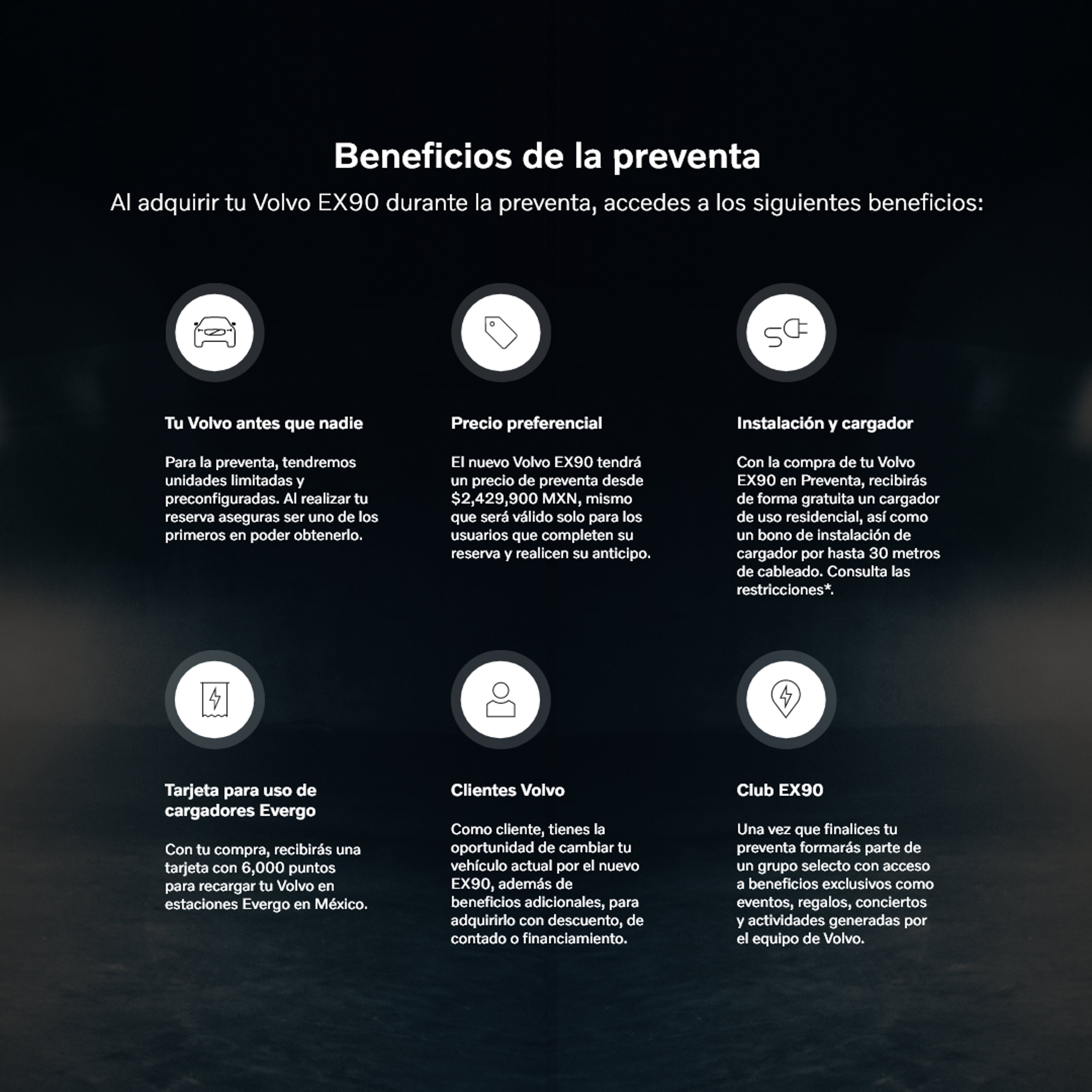 CONSULTA TÉRMINOS Y CONDICIONES DE PREVENTA AQUÍ. Términos y condiciones para la Instalación del cargador aquí. Términos y condiciones de tarjeta Evergo aquí. Precio de venta sugerido por el fabricante (MSRP) para VOLVO EX90, Versión Ultra 7 pasajeros Twin Motor modelo 2025, incluye IVA, el monto es expresado en pesos mexicanos. Para más información sobre configuraciones, reserva y apartado, consulta con tu distribuidor autorizado Volvo. Imágenes de carácter ilustrativo. Precios sujetos a cambios sin previo aviso.