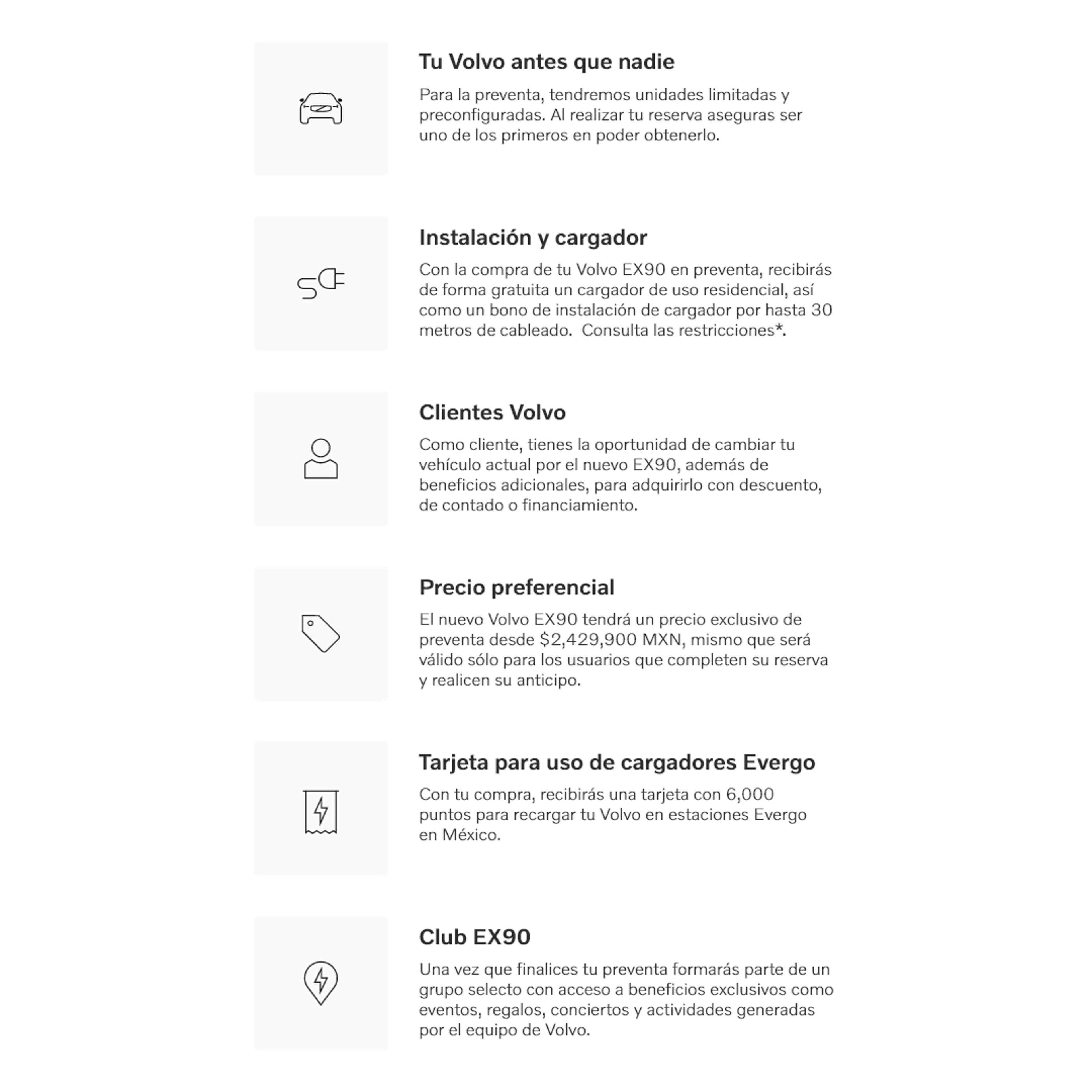 Al adquirir tu Volvo EX90 durante la preventa, accedes a los siguientes beneficios: