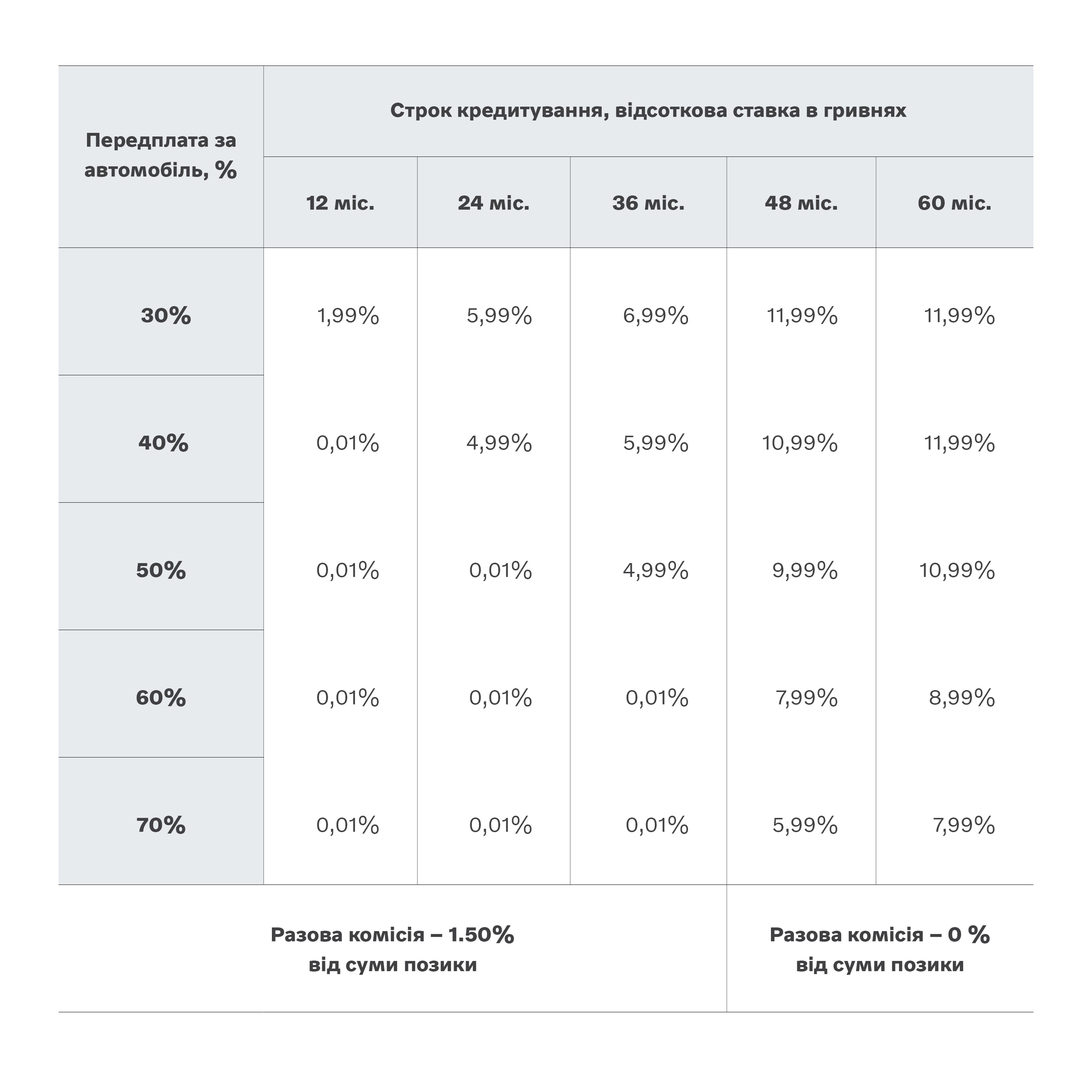 Ви можете отримати «Авто в кредит» на наступних умовах: макс. строк – 60 місяців, макс. сума – 2 500 000 грн., процентна ставка – від 0.01% до 11.99% річних, комісія за видачу кредиту – від 0% до 1.50 %, комісія за операції в Державному реєстрі – 750 грн. Реальна процентна ставка становить від 30,52 % річних річних (розрахована виходячи із строку кредитування 60 місяців, початкового внеску - 30% вартості автомобіля, процентної ставки – 11.99% річних, графіку погашення - ануїтет, страхування КАСКО – 6%, разової комісії за видачу кредиту – 0% від суми кредиту, вартості автомобіля – 1 000 000 грн.). Фактичне значення реальної річної процентної ставки за кредитом буде залежати від індивідуальних умов кредитування (суми кредиту, строку, спеціальних умов за продуктом тощо). Кредит надається у відділеннях Банку, на всій території України за виключенням тимчасово окупованої території. Ліцензія НБУ No99 від